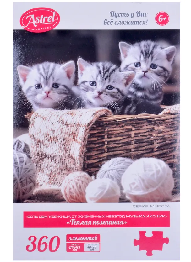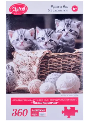 Милые котята и щенята, изображенные на пазлах из 360 элементов линейки Astrel, вызывают умиление и настраивают на позитивный лад! Каждый пазл является уникальным украшением интерьера, соберите всю коллекцию картин, которые сделают уютным и добрым каждый дом!