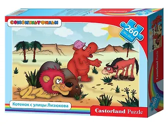 Пазл "Котенок с улицы Лизюкова" может порадовать детей. Из 260 элементов пазла можно собрать яркую картинку, на которой изображен кот Вася в обличье бегемота, помешавший льву охотиться на антилопу. Это фрагмент из анимационного фильма студии "Союзмультфильм", который любят и дети, и взрослые. Сборка мозаики значительно упрощается благодаря тому, что все ее составные части легко стыкуются друг с другом.