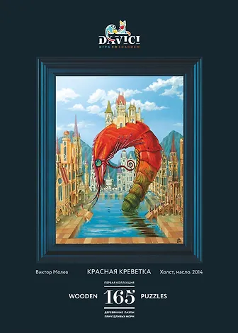 Гармоничная часть города или инородный объект? Креветка воплощает суть природы, а городские строения и мощеные мостовые только подчеркивают вечную диалектику природы и человека. В поддержку красной креветке - детали пазла: населяющие водную заводь представители мирового океана. Пазл очень приятен в сборке из-за художественности зацепов.