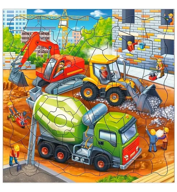 Очень классный пазл! Он фигурный, неклассический - но это прямо здорово! Есть узнаваемые по форме детали (дом, экскаватор, лопатка и др.), ребенок 2,5 года играет с удовольствием, начинает с них, а потом вокруг них выкладывает остальные детали. Картинка яркая, детали хорошо ложатся, есть рамка - основание. Единственный существенный минус - нет упаковки для хранения, вообще никакой. Пришлось самим изобретать пакет, иначе все детали разлетятся по комнате.