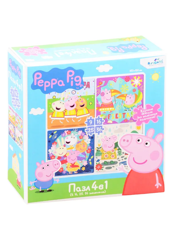 Набор пазлов 4в1 «Команда Пеппы» - это комплект пазлов, включающий в себя головоломки из 9, 16, 25, 36 элементов, объединенных общей тематикой. Это необычная коллекция картинок с изображением героев мультфильма "Свинка Пеппа", которая понравится любому ребенку. Соберите всю коллекцию и окунитесь в новое приключение! Постепенно усложняя сборку пазла от 9 элементов до 36 элементов, ребенок научится внимательности, концентрации, а также сможет развить мелкую моторику.