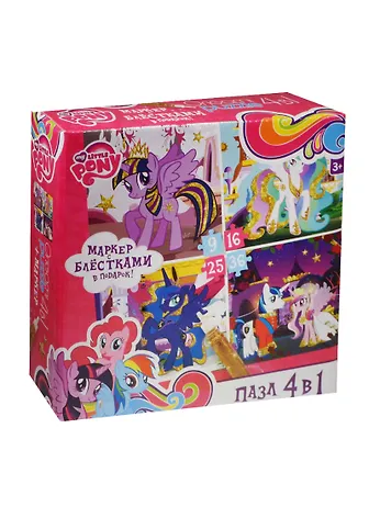Пазл 4 в 1 на 9, 16, 25, 36 элемента с маленькими пони – это приятный сюрприз для каждой принцессы. Собери красочные картинки с героями мульт-сериала «My little pony»! Это легко и просто. Пазл за пазлом пони страны Эквестрии будут рассказывать свои истории и делиться секретами.