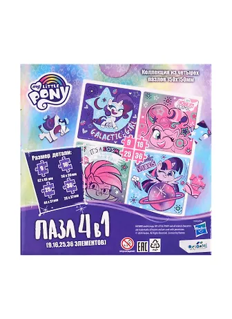 Набор пазлов 4в1 «Галактические пони» - это комплект пазлов с разной элементностью, включающий в себя головоломки из 9, 16, 25 и 36 элементов, объединенных общей тематикой. Это необычная коллекция картинок с изображением любимых персонажей My Little Pony, которая понравится любому ребенку. Постепенно усложняя сборку пазла от 9 элементов до 36 элементов, ребенок научится внимательности, концентрации, а также сможет развить мелкую моторику.