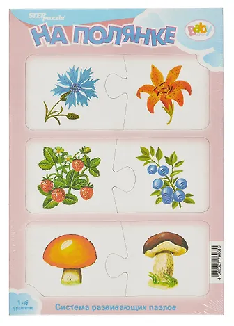 Игра два в одном: нужно выстроить логическую взаимосвязь между элементами и из 6 деталей составить три пары пазлов. Тематика игры: "На полянке" (ягоды, грибы и цветочки).
