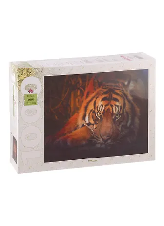 Пазлы мне понравились. Собираются достаточно сложно, много похожих деталей черного цвета, достаточно маленьких. Но итоговая картина того стоит, получается очень красивый и реалистичный тигр. Упаковка аккуратная, с пленкой, пазлы внутри собраны в мешочек и не потеряются. Детали все разрезаны, ровные, немного пылятся.