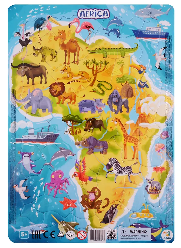Занимательная головоломка — пазл Африка. Создание настоящей карты континента из 53 элементов руками ребёнка. Фрагменты с изображениями животных, птиц и морских обитателей, заселяющих определённые природные зоны и воды континента познакомят ребёнка с общей информацией о территории, расширят кругозор и создадут начальные географические ориентиры. Иллюстрации пазла позволят заглянуть в каждый уголок Африки и самостоятельно познакомиться с его природными особенностями.