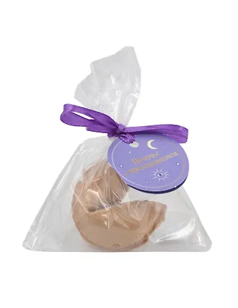 Печеньки очень оригинально оформлены - каждая завернута в отдельную упаковку - такой прозрачный пакетик в виде мешочка и перевязанный шелковой ленточкой фиолетового цвета. Внутри печеньки предсказание. Такие печеньки будут чудесным дополнением к любому подарку. Можно использовать как презенты для конкурсов на корпоративах и утренниках. Подойдут и для взрослых, и для детей.