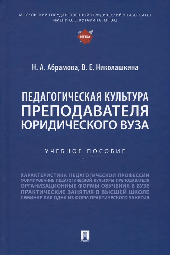 Изложенный в учебном пособии материал направлен на формирование основ профессионально-педагогической культуры преподавателя высшей школы, на освоение теоретических основ современной педагогической науки и практики. В пособии раскрываются особенности осуществления образовательного процесса в вузе, методы, средства и организационные формы обучения и воспитания. Освещаются проблемы организации научно-исследовательской работы студентов, а также контроля и оценки результатов обучения. Большое внимание уделяется внедрению современных педагогических технологий, повышению качества высшего юридического образования. Для магистрантов, аспирантов и молодых преподавателей вузов, слушателей системы повыше