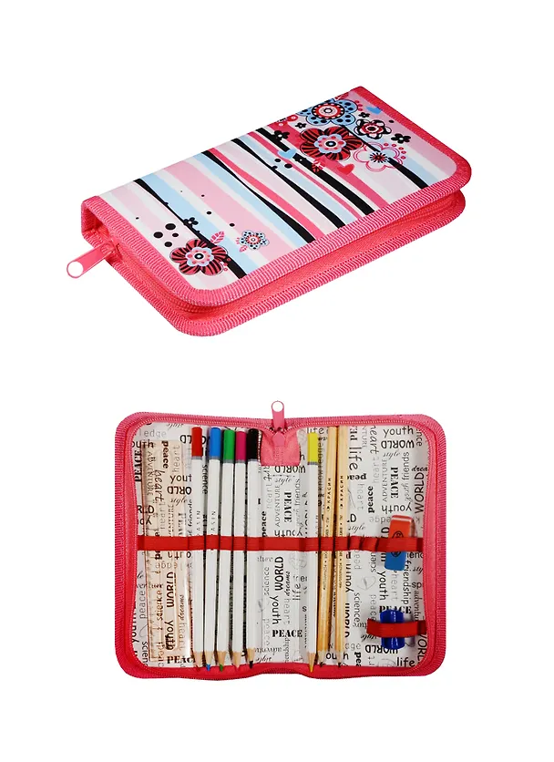 Для начала: подкупила стоимость - такой красивый пенал и недорого! Наполнение было сюрпризом, подарок порадовал девочку пяти лет: цветные карандаши, линейка - все что нужно для раскраски. В пенал помещается как оказалось, ещё и блокнотик
