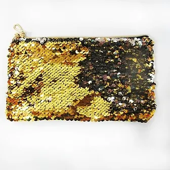 Пенал-косметичка реверсивные пайетки (золото/серебро) ХАМЕЛЕОН, джинса/золото, молния золото, цвет изделия меняятся в зависимости от направления "разглаживания" пайеток, размер 19х10см