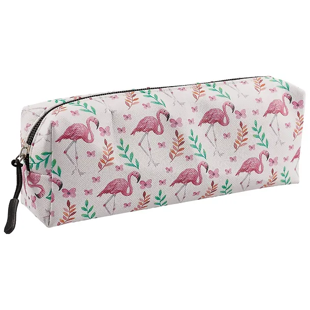 Пенал украшен принтом в виде фламинго и экзотических растений, которые будут напоминать вам о летних каникулах круглый год.