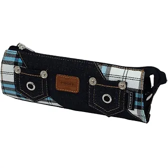 Пенал-косметичка - прямоугольный, 21*8*4см, джинсовый, темно-синий, 2 накладных кармана, текстильная клетчатая вставка, Proff