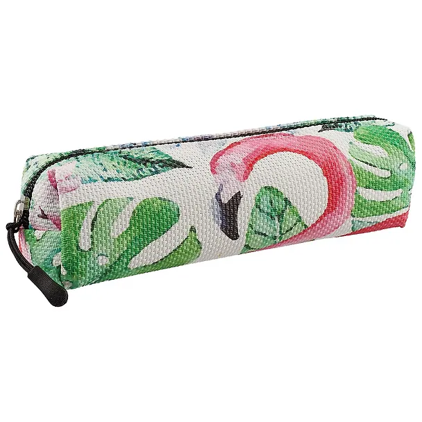 Пенал украшен принтом в виде фламинго и экзотических растений, которые будут напоминать вам о летних каникулах круглый год.
