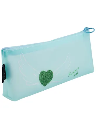 Материал изделия — плотный силикон трендового мятного цвета. На передней части есть блестящее зелёное сердечко и белые крылышки. Косметичка закрывается на молнию с держателем-кольцом.