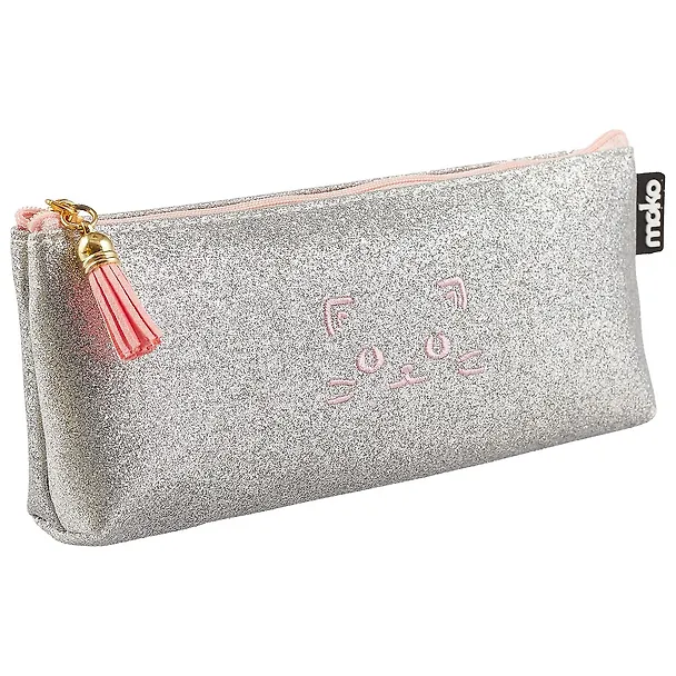 Очень красивый, добротный пенал. На мой взгляд, его довольно легко можно использовать и как косметичку. Дизайн очень красивый, блестки сверкают. Выглядит достаточно необычно и эффектно, очень нежным и красивым является сочатание серебристого и розового цвета. Милая кисточка на замочке. Пенал вместительный, все легко в него помещается.
