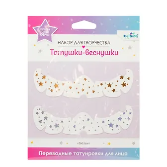 Прикольные татушки для лица. Брала себе на новогодний корпоратив, вторую отдала младшей сестре. Мне показались очень классными. Легко переносятся на лицо с помощью влажного полотенца, приложенного поверх бумаги. В общем принцип перенесения как и у обычных переводных картинок. Проблем со снятием этой красоты тоже не испытала – легко убирается двухфазным средством для снятия макияжа. По размерам конечно больше на девочку лет 13-15 подходит.