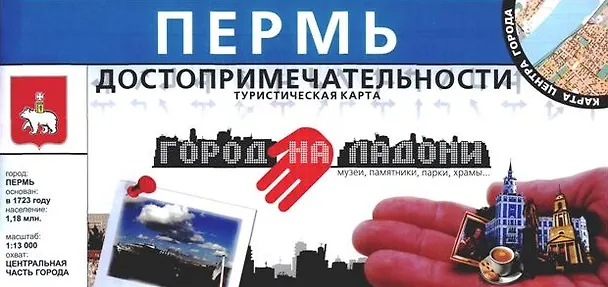 Карта-путеводитель по городу Пермь «Город на ладони». Карта - полезна не только для гостей города, но и для жителей Перми. Она поможет вспомнить, а порой и узнать, какие красивые места есть в городе, какие достопримечательности посетить, что показать, как рассказать гостям об интересном городе. От издателя: Пермь требует любви и снисхождения. Не стоит с порога кричать «что за провинция», лучше попробуйте приглядеться внимательнее. Много воды и деревьев, спокойные улицы и старинные особняки. Музей современного искусства с модно-скандальным московским галеристом во главе, своеобразное чувство юмора. Например, речушка, отделяющая город от кладбища, называется Стикс; минералогический музей назыв