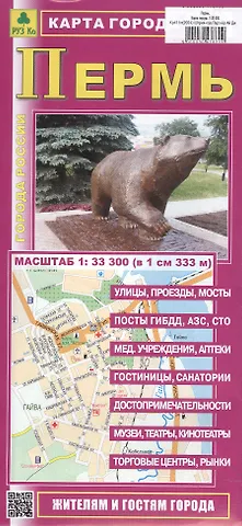 Двусторонняя полноцветная карта. Содержит подробный план города со всеми улицами, номерами угловых домов. Указано расположение административных зданий и социально-культурных объектов. Имеется указатель улиц. Масштаб г. Пермь 1:33 300 Указано расположение постов ГИБДД, автозаправочных станций, гостиниц.
