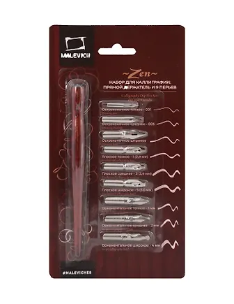 Набор для каллиграфии от бренда «Малевичъ» отлично подойдет тем, кто начал интересоваться искусством красивого письма. В наборе 9 перьев с различной формой и толщиной наконечника и держатель. Перья и держатель универсальны и могут использоваться с инструментами для каллиграфии других брендов.