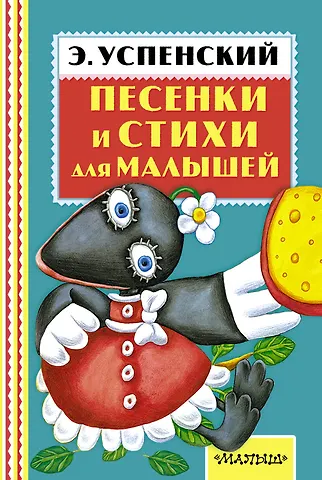 «Книжная полка "Малыша» – это такая специальная серия книг для маленьких. Благодаря небольшому формату и малому количеству страниц книгу удобно держать в руках и везде носить с собой. В книгу «Песенки и стихи для малышей» вошли только самые известные стихотворения Э. Успенского, ставшие песнями: «Голубой вагон», «Чебурашка», «Вера и Анфиса» и др., – и столь же знаменитые стихи: «Ехал Ваня на коне…», «Если был бы я девчонкой…», «Разгром».