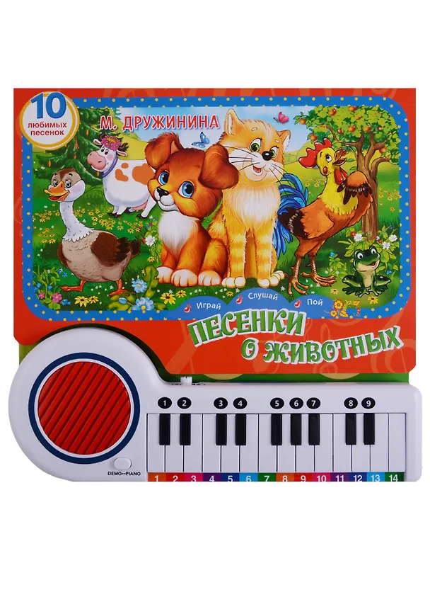 Музыкальная книга-пианино "Песенки о животных" позволит ребенку прослушать 10 веселых песенок на стихи М. Дружининой. На страницах книжки расположены яркие цветные картинки с изображением симпатичных животных. Ребенок сможет подпевать исполнителям и наигрывать забавные мелодии, нажимая на клавиши внизу книжки. Электронная книга-пианино развеселит ребенка и позволит ему натренировать память, усовершенствовать слух и и познакомиться с замечательным клавишным инструментом.