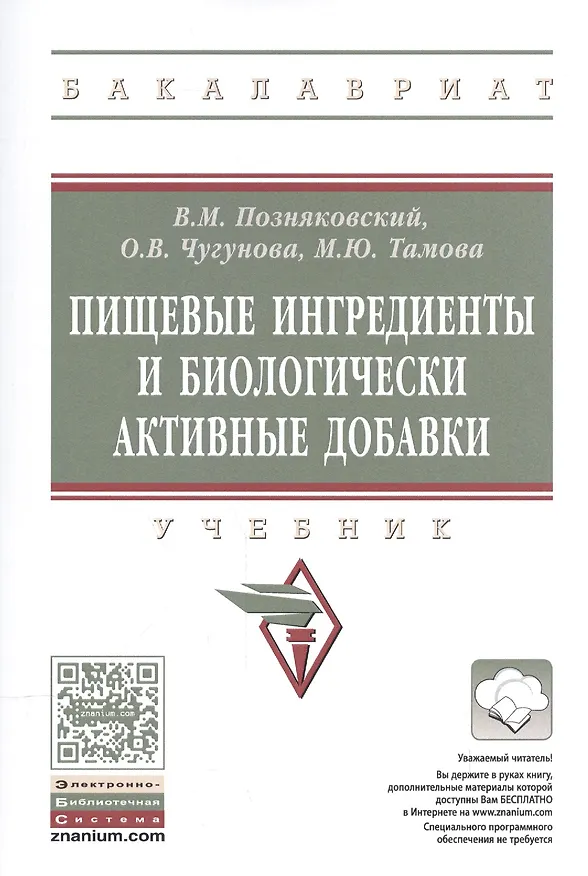 Рассмотрена характеристика применяемых в настоящее время пищевых ингредиентов (пищевые добавки, ароматизаторы, технологические вспомогательные средства) и биологически активных добавок. Представлен аналитический обзор фундаментальной и периодической литературы, приводятся последние нормативные документы, регламентирующие использование пищевых ингредиентов и биологически активных добавок. Соответствует требованиям Федерального государственного образовательного стандарта высшего образования последнего поколения. Для студентов, обучающихся по направлениям подготовки 19.03.04 и 19.04.04 «Технология продукции и организация общественного питания».