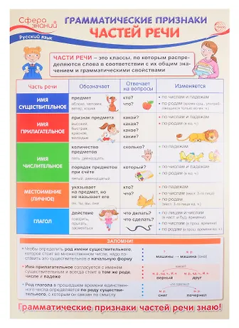 Плакат А3 "Грамматические признаки частей речи". Для занятий по русскому языку с учащимися 3-х классов общеобразовательных организаций