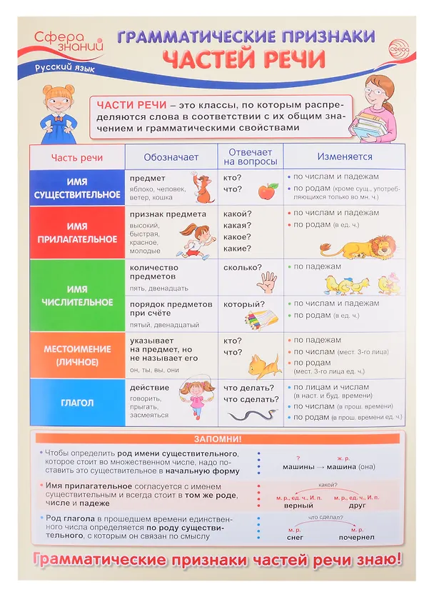 обозначают, на какие вопросы отвечают, как изменяются), даст им соответствующие характеристики, научит определять род глагола и имени существительного, а также род, число и падеж имени прилагательного. Плакат легко разместить в классной комнате, также с ним удобно изучать тему в домашних условиях.