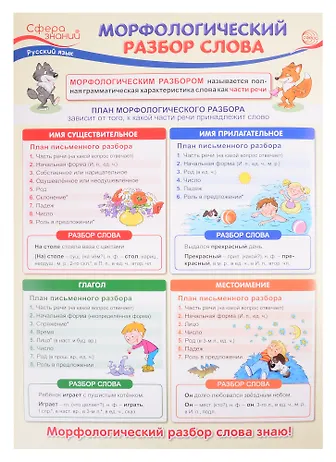 последовательности морфологического разбора частей речи, а также рекомендации по правильному разбору с различными примерами. Плакат можно разместить в классной комнате, также с ним