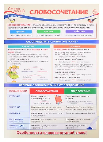 и отличительных свойствах, научит находить главное и зависимое слово, отличать словосочетание от слова и предложения, приведет примеры синтаксических конструкций, которые не являются словосочетаниями. Плакат можно разместить в классной комнате, также с ним удобно изучать тему в домашних условиях.