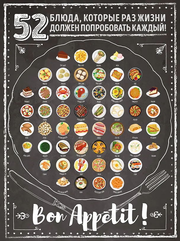 Для того чтобы попробовать национальную кухню разных стран, не обязательно посещать весь мир. Мы подготовили для вас список из 52 блюд, которыми лакомятся в Италии, Грузии, Канаде, Венгрии, Литве и других странах. Все просто: выбираете понравившиеся блюдо и пробуете его. Или устройте классный вечер, зовите друзей, готовьте и наслаждайтесь вместе лакомствами со всего мира! После того как продегустировали блюдо, стирайте скретч-слой. Такой плакат станет стильной частью вашего интерьера или необычным подарком близким людям.