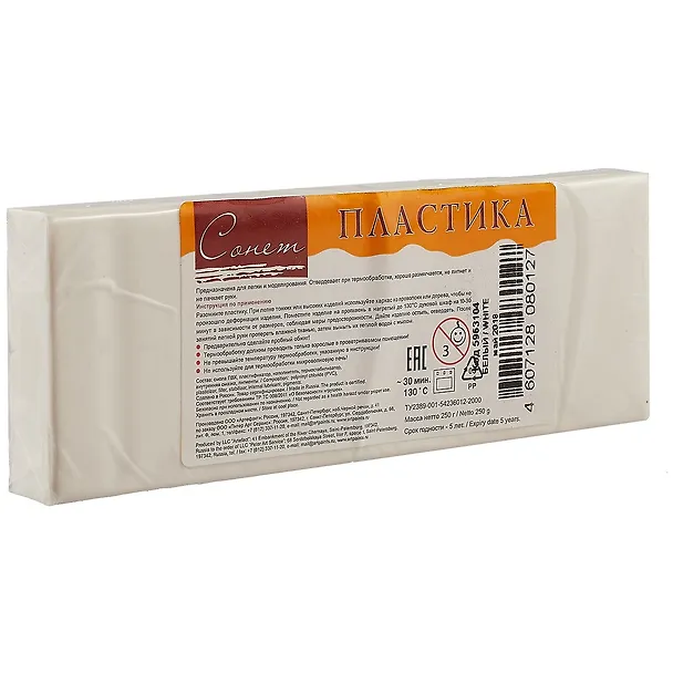 Пластика "Сонет" предназначена для лепки и моделирования. Отвердевает при термообработке, хорошо размягчается, не липнет и не пачкает руки.