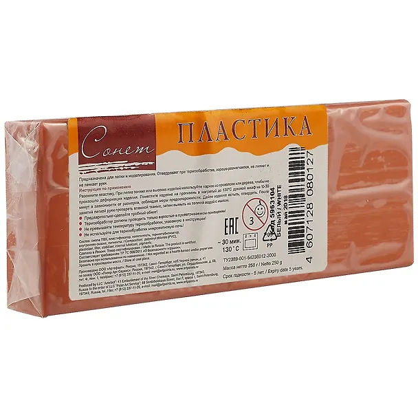 Пластика "Сонет" предназначена для лепки и моделирования. Отвердевает при термообработке, хорошо размягчается, не липнет и не пачкает руки.