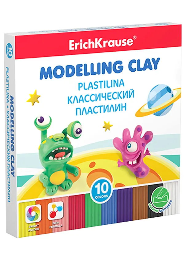 Когда покупаю товары для творчества всегда выбираю Erichkrause . Пластилин находится в картонной коробке,на который изображены забавные инопланетяне на Луне. Внутри десять прямоугольных брусочков.Яркие красивые цвета у каждого брусочка. Пластилин хоть и считается классическим, но при этом консистенция у него достаточно мягкая. Данный товар понравился, всем советую