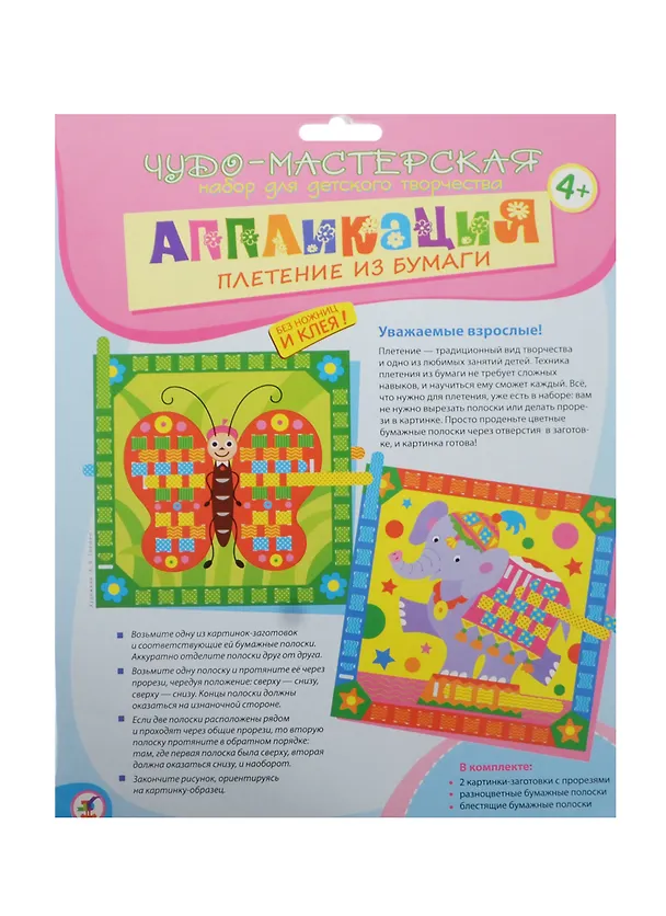 Плетение — традиционный вид творчества и одно из любимых занятий детей. Техника плетения из бумаги не требует сложных навыков, и научиться ему сможет каждый. Всё, что нужно для плетения, уже есть в наборе: вам не нужно вырезать полоски или делать прорези в картинке. Просто проденьте цветные бумажные полоски через отверстия в заготовке, и картинка готова!