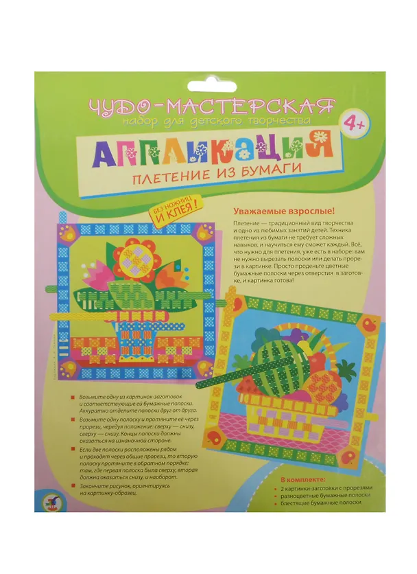Плетение — традиционный вид творчества и одно из любимых занятий детей. Техника плетения из бумаги не требует сложных навыков, и научиться ему сможет каждый. Всё, что нужно для плетения, уже есть в наборе: вам не нужно вырезать полоски или делать прорези в картинке. Просто проденьте цветные бумажные полоски через отверстия в заготовке, и картинка готова!
