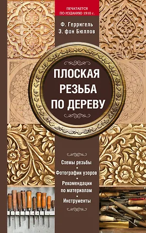 В книге "Плоская резьба по дереву" описан весь процесс резьбы от самых простых геометрических фигур до сложных узоров, начиная от рекомендаций по выбору материала, разметки рисунка, описания приемов резьбы до окончательной отделки (очистка, травление, вощение).