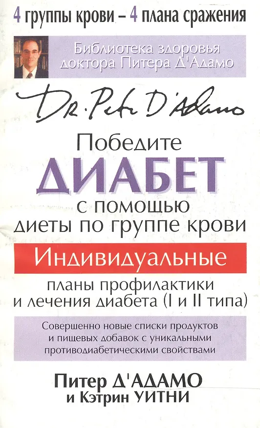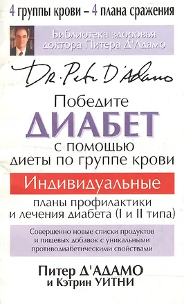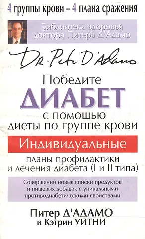 Доктор Питер Д`Адамо, автор книг о диете по группам крови, которые навсегда изменили подход человечества к вопросам оздоровления и снижения веса, представляет вниманию читателей эффективную программу борьбы с диабетом. Если считать стандартную диету по группам крови фундаментом, то содержащиеся в этой книге рекомендации помогут построить на нем оптимальный план мероприятий для тех, у кого обнаружен диабет, преддиабет, гипогликемия или гипергликемия. Диета по группам крови в сочетании с соответствующим образом жизни значительно обогащает арсенал средств борьбы с болезнью, позволяя взять под контроль уровень сахара в крови и улучшить обменные процессы. В результате вы ощутите прилив сил, ваше