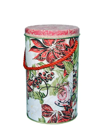 Подарочная туба с рисунком красных цветов и ягод металлическая с ручкой-веревочкой.