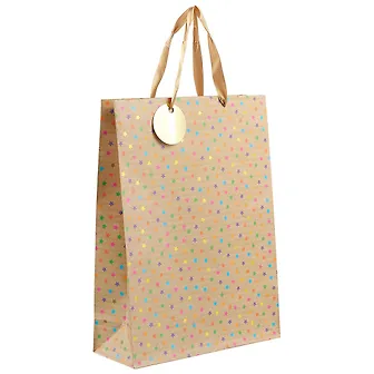 Пакет «Яркие звёздочки» сделан из плотной бумаги и украшен маленькими разноцветными звёздочками. Такой пакет подойдёт для упаковки подарка имениннику любого возраста.