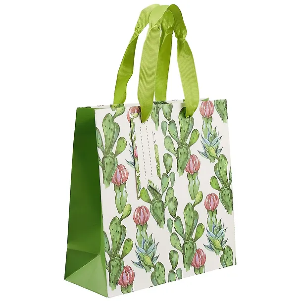 Очень приятный принт: "акварельные" кактусы (привитые на подвой розоватые гимнокалициумы и опунции), нежные цвета на светлом фоне, подойдет любителям суккулентов. бумага плотная матового ламинирования. Боковые стороны пакета - нежно зеленые, ручки из плотной крепированной ленты ярко-салатового цвета, достаточно прочные.