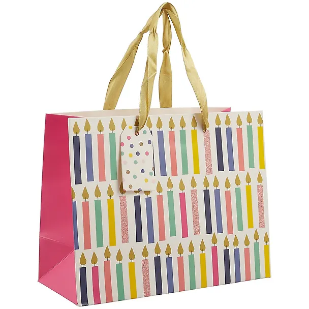Данный пакет несомненно станет идеальной упаковкой для любого подарка на день рождения. По бокам пакет ярко розового цвета, на лицевой стороне пакеты нарисованы разноцветные свечи. Сам пакет небольшого размера (23 на 18 см), поэтому заранее измерить свой подарок, чтобы он наверняка поместился в пакет. Что касается качества пакета, он сделан хорошо. Ручки в пакете из атласной золотой ленты.