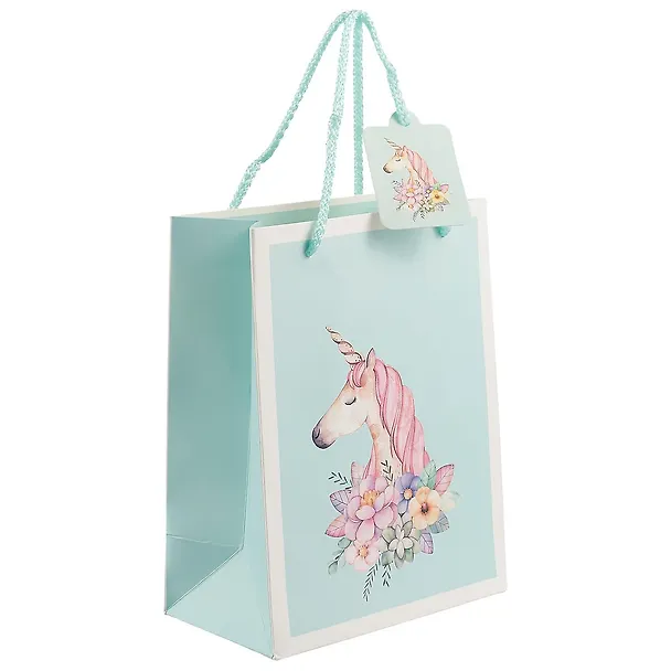 Пакет «Нежный единорог» сделан из плотной бумаги и украшен милым изображением единорога. Он отлично подойдёт для упаковки подарка имениннице любого возраста.