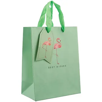Замечательный нежный из очень плотной бумаги (толще обычных подарочных пакетов) красивый пакет. Подойдет для подарка молодой женщине и/или девочке. Популярный принт фламинго размещен на этикетке и на лицевой стороне пакета. Сам пакет из бумаги нежно-мятного цвета с разводами и рельефной поверхностью (поперечные и продольные выпуклые пересекающиеся линии - на фото не видно). Очень приятное дополнение к подарку.