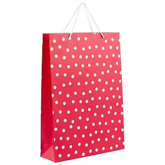 Пакет «Горошек» сделан из плотной красной бумаги и украшен принтом в виде белых горошин. Такой пакет подойдёт для упаковки подарка имениннице любого возраста.