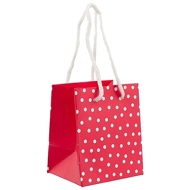Пакет «Горошек» сделан из плотной красной бумаги и украшен принтом в виде белых горошин. Такой пакет подойдёт для упаковки подарка имениннице любого возраста.