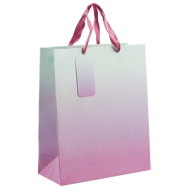 Пакет «Небесный градиент» сделан из плотной бумаги, украшен золотистыми блёстками и розовым градиентом. Он отлично подойдёт для упаковки подарка имениннице любого возраста.