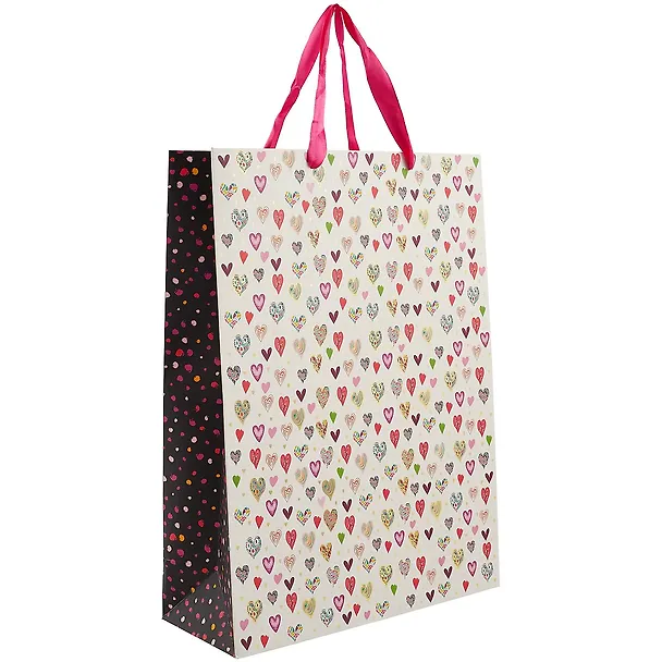 Отличный подарочный пакет. Дизайн красочный и стильный. Сердечки поменьше - фольгированные и очень красиво играют на свету. Сам пакет плотный и достаточно объемный, выполнен качественно. Выглядит даже лучше, чем на фото. Для большого подарка девушке подойдет идеально. За такую цену (со скидкой за 63 р на время написания отзыва) определенно стоит брать.