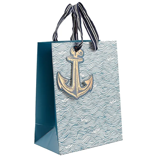 Пакет «Морской круиз» сделан из плотной бумаги и украшен сложным морским принтом с бронзовым якорем. Он отлично подойдёт для упаковки подарка имениннику любого возраста.