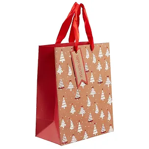 Пакет «Праздничные ёлочки» сделан из плотной бумаги и украшен принтом с разными нарядными ёлочками. Такой пакет подойдёт для упаковки новогоднего подарка.